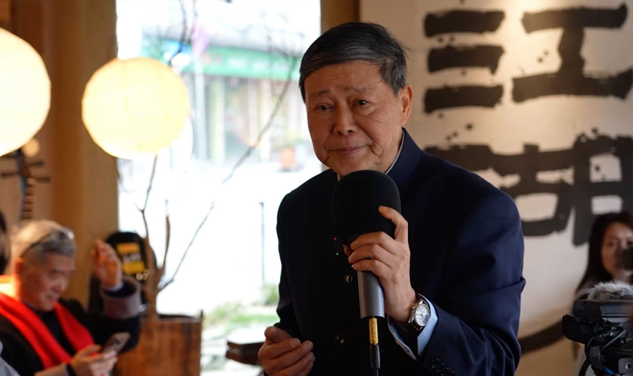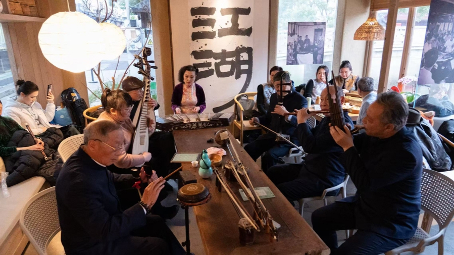 活动开场时,上海音乐学院中国仪式音乐研究中心研究员萧梅站到茶桌前。她身后,悬着“江湖”二字的书法作品。乐师与听客之间,只隔着三五步距离。“江湖对应的是庙堂,学院或文艺舞台有点像庙堂,而江湖则是把丝竹放回它原来的生活环境,让非遗江南丝竹的内涵真正在上海的民间生活中重新活起来。”