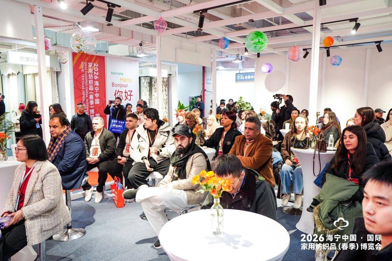 2026海宁中国·国际家用纺织品(春季)博览会外贸对接会现场(博览会供图)2005年前后,当地企业大规模引进德国、意大利电子提花机等先进设备,从普通面料转向高附加值的提花布,一举确立“产量、内销、出口均列全国第一”的地位。